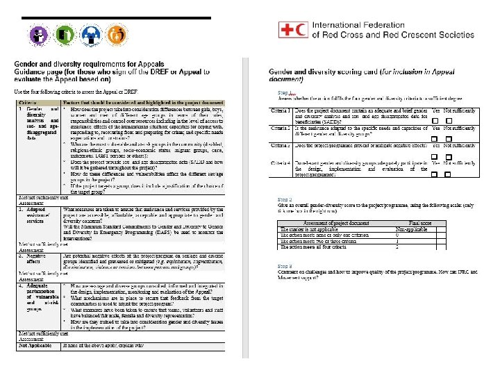What does it do? ü ü ü It considers gender and age issues and also explicitly takes diversity into account It assesses proposals and project implementation including Appeals (and can be used for all other programmes or services) It focuses on quality criteria It is a collaborative learning tool, engaging both partners and staff in a constructive dialogue It is used by some NSs and is based on evidence from donors on what works, helping us to monitor integration of G&D considerations in projects/programmes and adjust support (and importantly to measure our indicators in the Plan and Budget)