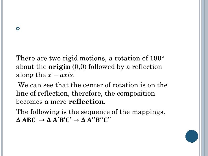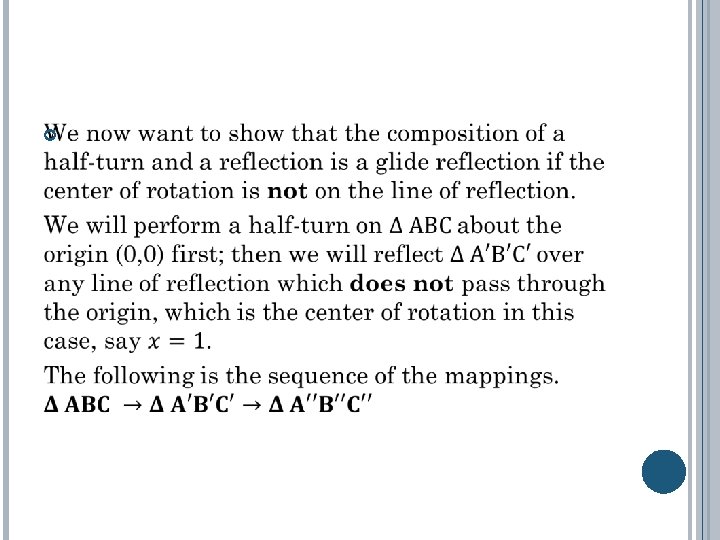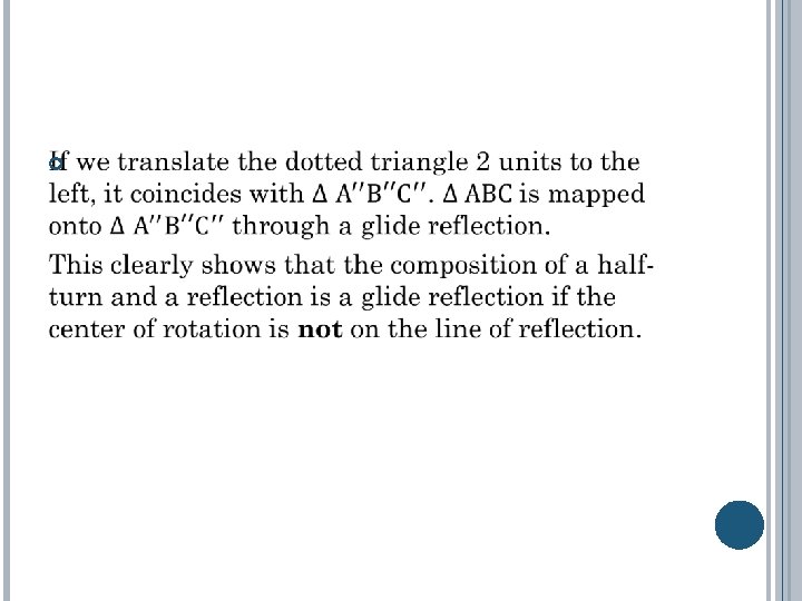 Theorem: The composition of a half-turn and a reflection is a glide reflection if the center of rotation is not on the line of reflection. Note In a case where the center is on the line of reflection, the composition becomes a glide reflection where the translation involved is of zero distance, that is a mere reflection. Thus, this can be termed as a special case of the line.