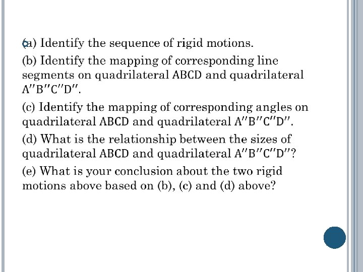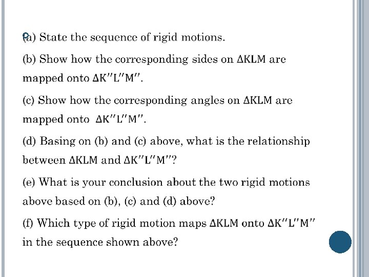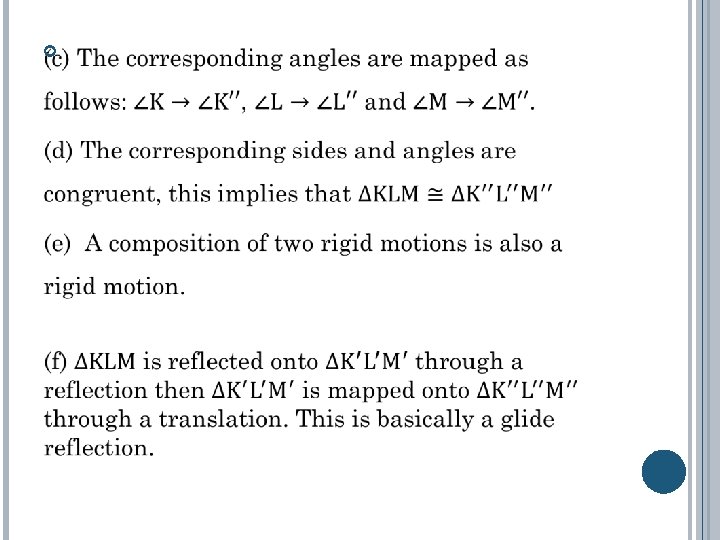 We know that under any type of rigid motion: 1. Lengths of line segments on the plane figure are preserved 2. Angle measures of the plane figure are preserved 3. Collinear points remain collinear after the transformation 4. Parallel lines remain parallel after the transformation