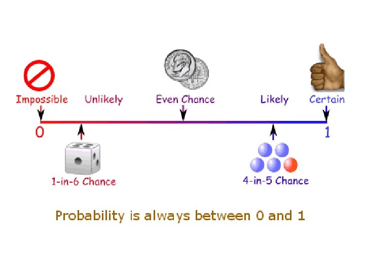 Let’s review what we found: • When would you expect a probability of an event occurring to be 1 or 100%? Probability should be 1 or 100% for a certain event, for something that MUST happen. • When would you expect the probability of an even occurring to be 0 or 0%? Probability should be 0 or 0% for an impossible event, for something that CANNOT happen.