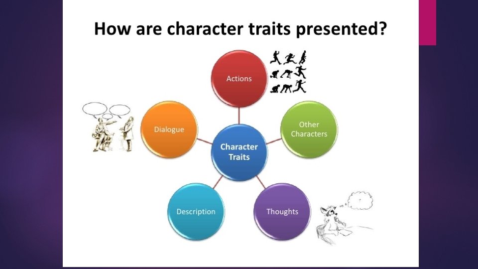 Project Requirements 1. Title slide -> with group’s names 2. Introduce your character -> Name, role in story, what kind of character are they. 3. Slide with Illustration -> Create a picture of your character that shows their personality and role in the story. 4. Slide with Dialogue -> examples of the character’s speech with explanations. 5. Slide with Actions -> examples from the text that depict the character’s actions. These must be explained to demonstrate characterization.