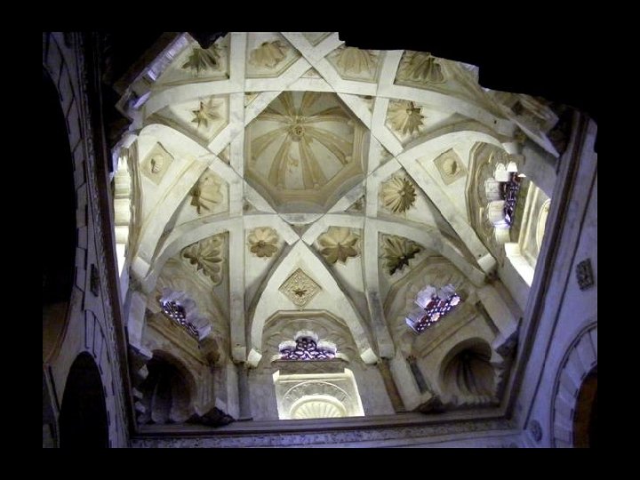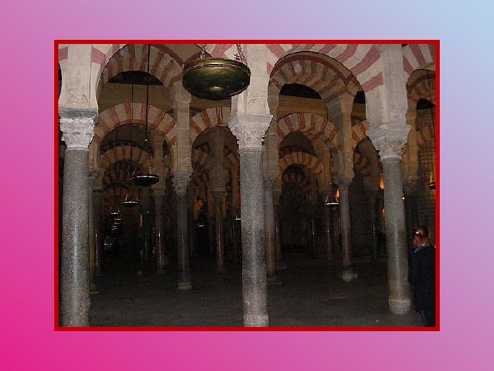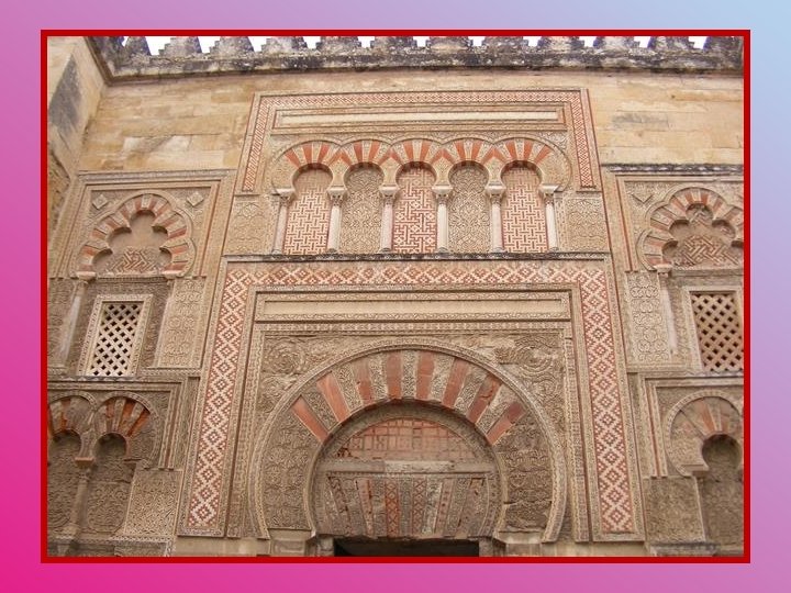 L’émir Abd er-Rahman Ier entreprit la construction de la Grande Mosquée de Cordoue vers 785, à l’emplacement de l’ancienne église wisigothique de San Vincente. Cette construction originale de onze vaisseaux ouvrant sur la cour des Orangers comportait une innovation architecturale unique qui la rendit célèbre : pour augmenter la hauteur, on eut recours à la superposition de deux étages d’arcs en édifiant au-dessus des colonnes un second étage avec des piliers élancés. L’émir Abd er-Rahman II (833 -848) procéda à un premier agrandissement; puis Al-Hakam II (961) en fit un autre et construisit l’actuel mihrab; finalement, Al-Mansour (987) ajouta huit autres vaisseaux parallèles aux premiers et donna à la Grande Mosquée ses dimensions définitives. Pendant huit siècles, la Grande Mosquée de Cordoue demeura l’un des phares de la spiritualité musulmane en Occident. Formant un quadrilatère de 174 mètres par 137, la mosquée couvre une surface de 23 400 m² (près de 252 000 pieds carrés). Elle possède 19 nefs et 856 colonnes de marbre, d’albâtre et de granit.