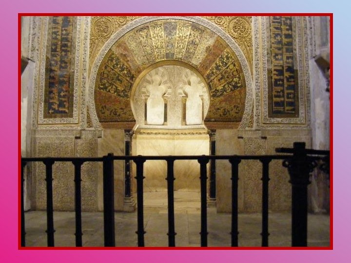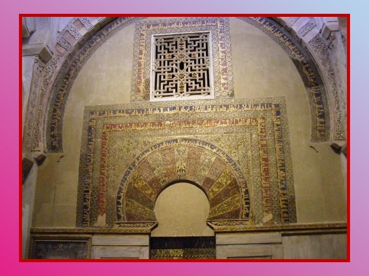Le mihrab est un espace pratiqué dans la muraille d’une mosquée, près duquel l’imam officie et dirige la prière. Le mihrab de la Mosquée de Cordoue est considéré comme une pure merveille. Ce sont des artistes byzantins envoyés par l’empereur chrétien Nicéphore Phokas qui réalisèrent les mosaïques décorant son arc d’entrée, mosaïques offertes par l’empereur. L’alfiz (qui est le panneau rectangulaire qui entoure les bords extérieurs de l’arche) égrène les 99 noms d’Allah.