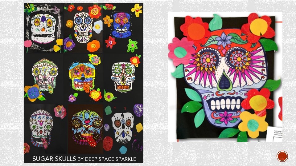 1. Draw your Skull shape on a large piece of white paper in pencil and then go over with sharpie – remember your want your skull to be symmetrical 2. Draw in your eye shapes, nose shape and mouth shape 3. Decorate your skull with vibrant colors, designs & symbols. Remember this art project is all about SYMMETRY! 4. Cute out your skull and glue it on a black piece of paper 5. Cut or draw marigold flowers to add to your project
