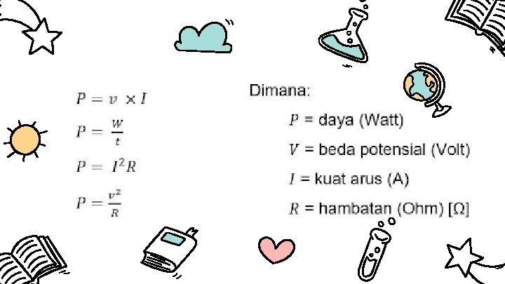 Rumus daya : P=Vx. I P = Volt x Ampere x Cos φ P = Watt di mana : P= Daya (Watt atau W) W= Usaha (Joule atau J) T= Waktu (second atau s) V = Tegangan (Volt atau V) I = Arus Listrik (Ampere atau A)