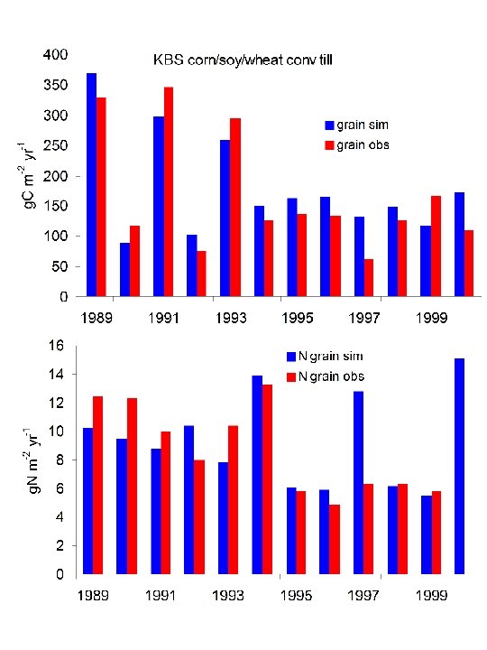 Improved NPP Submodel Potential Growth (CO 2, T, H 2 O) Nutrients Shading Crop H 2 O GRAIN C, N, P, S SHOOT C, N, P, S Tillage Temp H 2 O NPP Phenology Nutrient/H 2 O stress SURFACE LITTER ROOT C, N, P, S Temp H 2 O SOIL LITTER PG = Gpot*F(light)*F(LAI)*F(Temp)*F(H 2 O) Del Grosso et al. in prep.