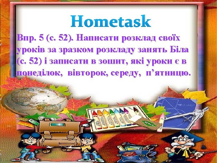 Read the text “Bill’s timetable” Ex. 2, p. 52 Answer my questions: How many days do the children go to school? They go to school five days a week. What are these days? These days are Monday, Tuesday, Wednesday, Thursday and Friday. When don’t they go to school? They don’t go to school on Saturday and Sunday.