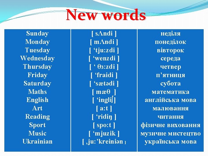 Fill in the gaps. Ex. 4, p. 52 On Monday they have got Maths, English and Art. On Tuesday they have got English , Reading and Sport. On Wednesday they have got English , Maths and Music. On Thursday they have got Maths , English and Sport. On Friday they have got Maths , Reading and Music.