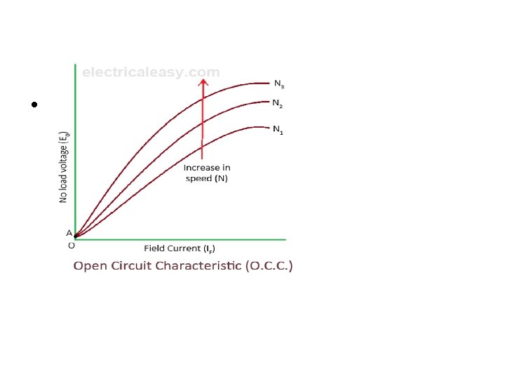 • Open Circuit Characteristic (O. C. C. ) (E 0/If) • Open circuit characteristic is also known as magnetic characteristic or no-load saturation characteristics • Relation between generated emf at no load (E 0) and the field current (If) at the given fixed speed. • The O. C. C. curve is just the magnetization curve and it is practically similar for all type of generators. • The data for O. C. C. curve is obtained by operating the generator at no load and keeping speed constant. Field current is varied and the corresponding terminal voltage is recorded.