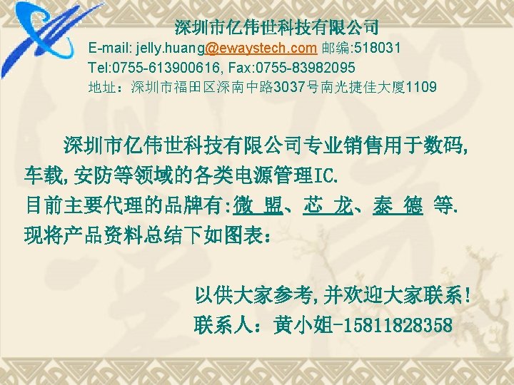 降压恒流DC-DC 型号 输入电压 输出最大电流 封装 开关频率 输出恒流 设置 备注 XL 3002 5 -32 V 3. 2 -30 V 1. 5 A SOP 8 L 200 K ADJ(0. 22 V ) 0 -10 WLED XL 3003 5 -32 V 3. 2 -30 V 2. 5 A SOP 8 -EP 200 K ADJ(0. 22 V ) 10 -20 WLED XL 3004 5 -32 V 3. 2 -30 V 4 A TO 252 -5 L 200 K ADJ(0. 22 V ) 20 W-50 WLED XL 8002 12 -80 V 3. 2 V-60 V 3 A 40 WLED 线性恒流LED显示屏及背光驱动 型号 输入电压 输出电流 封装 开关频率 输出响应 备注 ME 2600 3. 3 -5. 5 V 5 -40 MA SOP 24/SS 0 P 24 30 M 35 ns LED显示屏 ME 2604 3. 3 -5. 5 V 3 -45 MA SOP 24/SS 0 P 24 25 M 70 ns LED显示屏 MEL 71 XX 2. 7 -6. 0 V 350 MA SOT 89 -3 背光驱动 ————深圳市亿伟世科技有限公司