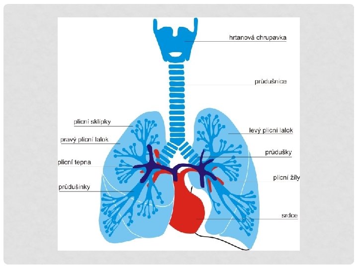 KUDY PROCHÁZÍ VZDUCH? Vdechnutý vzduch vstupuje do dýchací soustavy nosem nebo ústy. Vzduch proudí dutinou nosní, postupuje trubicí zvanou hrtan a dál její částí zvanou průdušnice. Ta se na konci větví do průdušek, kterými vzduch vstupuje do plic.