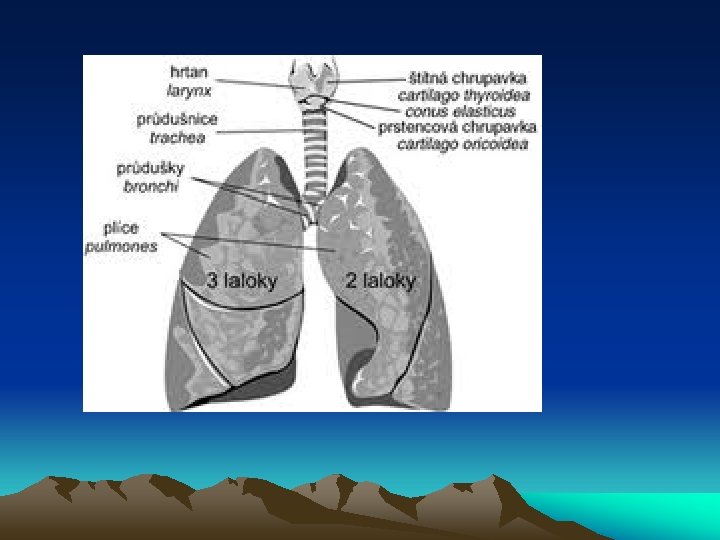 Dolní cesty dýchací • Průdušky: pravá a levá ( bronchus dexter a sinister, průdušky do plicních segmentů • (bronchy) a bronchioly ( již bez chrupavky, jen vazivo • Hladká svalovina ve stěně, parasympatikus průměr průdušek zužuje, sympatikus rozšiřuje