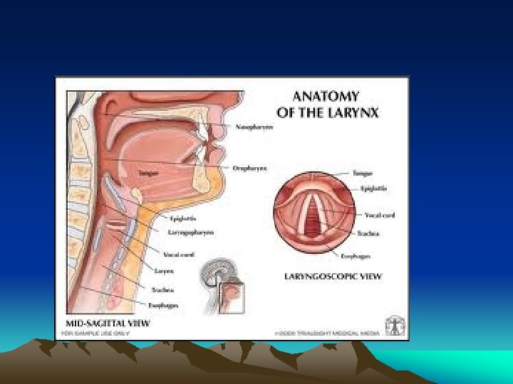 Horní cesty dýchací Nosohltan nasofarynx: mezi dutinou nosní a hltanem, Eustachova trubice , hltanová mandle, sfenoidální kost nahoře, měkké patro dole • Hltan: měkké patro, jazyk, zadní stěna • Hrtan larynx : chrupavky, nepárové: ŠTÍTNÁ, Prstencová, Epiglottis, párové : hlasivkové , rohové , klínové • Hlasové vazy : nepravé/ červené/ a pravé –bílé, inervace n. recurrens • Trachea ( průdušnice ): délka asi 12 cm průměr 2 cmprstencové chrupavky, tvaru C , končí u horního okraje 5, hrudního obratle