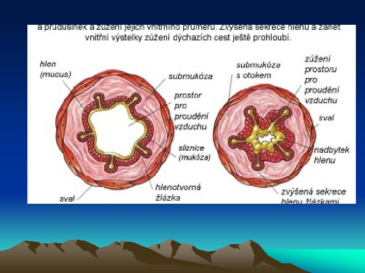 Dolní cesty dýchací • Průdušky: pravá a levá ( bronchus dexter a sinister, průdušky do plicních segmentů • (bronchy) a bronchioly ( již bez chrupavky, jen vazivo • Hladká svalovina ve stěně, parasympatikus průměr průdušek zužuje, sympatikus rozšiřuje