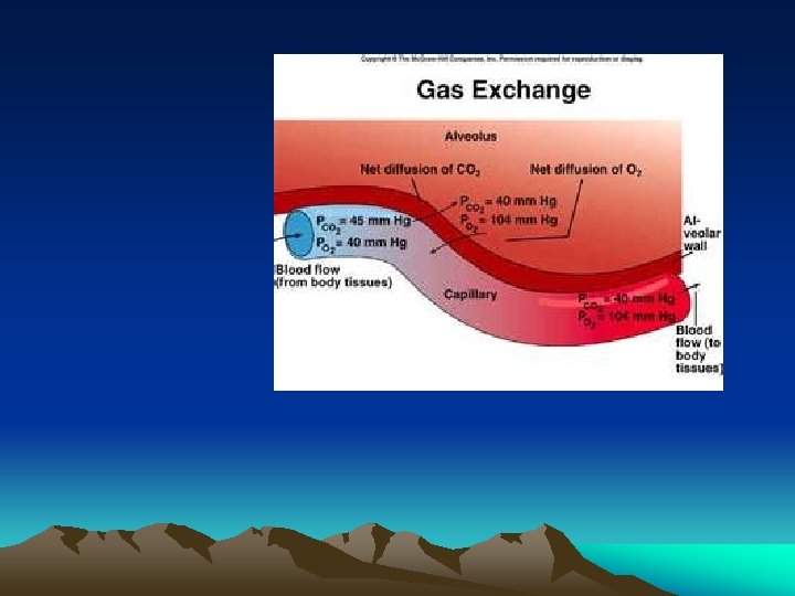 Výměna dýchacích plynů • Plíce: • p. O 2 ve vzduchu 21 k. Pa v sklípcích 13, 3 k. Pa ve venozní krvi 5, 3 k. Pa, difuze končí při vyrovnání tlaků • p. CO 2 v odkysličené krvi 6, 1 k. Pa, ve sklípcích 5, 3 k. Pa v atmosféře 0, 04 k. Pa • Tkáně: arterioly p. O 2 pod 12, 6 k. Pa tkáně 5, 6 k. Pa, p. CO 2 5, 3 k. Pa v cévách, v buňce více než 6 k. Pa