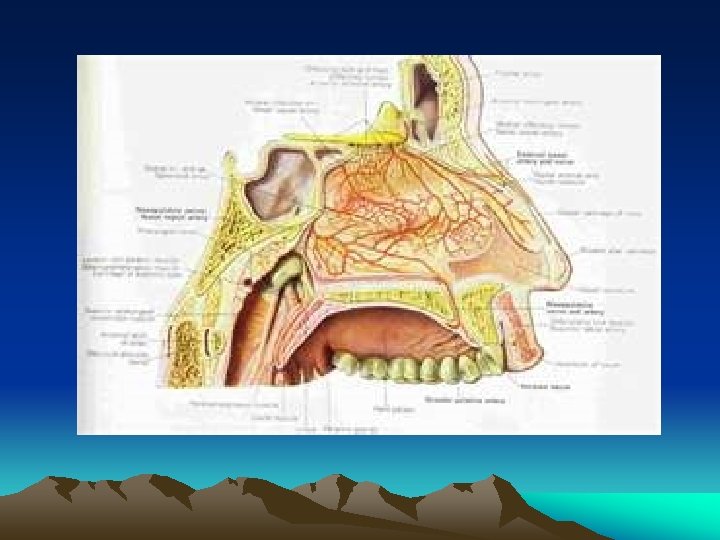 Stavba • Dutina nosníKosti: čelní čichová, nosní kůstky , horní čelist, patrová kost Chrupavky: 2 u vstupu Vazivo: nosní přepážka , měkké patro • Paranasální siny : frontální, maxilární , sfenoidální • Výstelka: cylindrický řasinkový epitel • Funkce: předehřívání, ohřívání, čištění, imunita, rezonance, čich