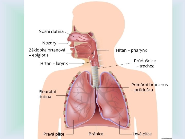dýchání • řízeno reflexně (prodloužená mícha) • frekvence: 12 až 15/min • maximální výdech: 2, 5 - 5 l vzduchu = vitální kapacita plic (po usilovném výdechu zůstává v plicích 1 -1, 5 l) • minutový dechový objem: v klidu cca 7 l (0, 5 l každý vdech a výdech); zátěž až 220 l