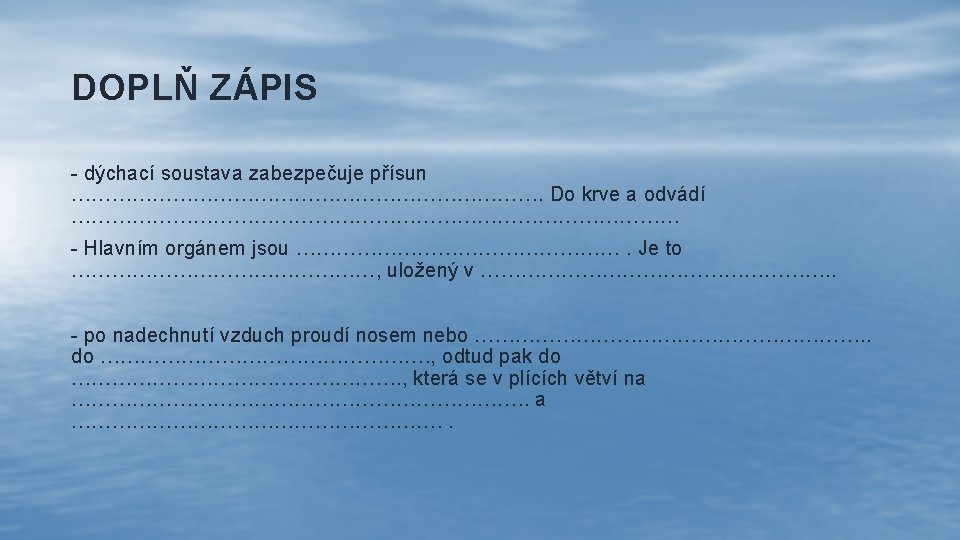 DÝCHACÍ SOUSTAVA ZÁPIS DO SEŠITU • Dýchací soustava zabezpečuje přísun kyslíku do krve a odvádí kysličník Uhličitý - Hlavním orgánem jsou plíce. Je to párový orgán uložený v hrudníku - Po nadechnutí vzduchu proudí nosem nebo ústní dutinou do hrtanu, odtud pak do průdušnice, která se v plicích větví na průdušky a na menší průdušinky