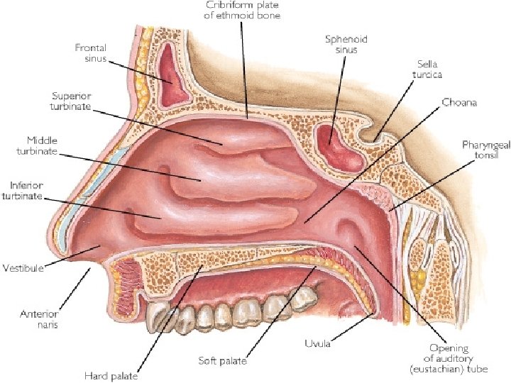 Dutina nosní 1. 2. vestibulum nasi (kůže + vibrisae) cavum nasi proprium: regio respiratoria sliznice dých. cest, venózní plexus regio olfactoria smyslový epitel, serózní tubulózní žlázky (gll. Bowmani) Podklad sliznice: kost, chrupavka, Tela submucosa CHYBÍ - sinus paranasales - nasopharynx palatum