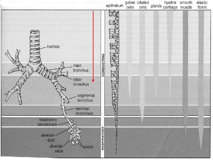 Dýchací cesta: 1. Vyztužená stěna (chrupavka, event. kost) 2. Sliznici kryje víceřadý cyl. epitel s řasinkami 3. Funkce – vedení a úprava vzduchu: odstranění vdechnutých částic – hlen zvlhčení – smíšené žlázky ohřev – venózní pleteně