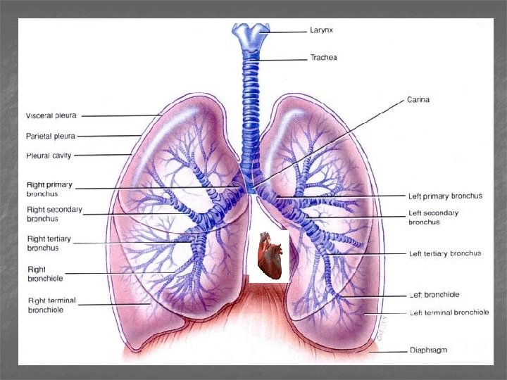Plíce a bronchy n n Plíce – bronchi principales Plicní laloky – bronchi lobares (sekundární) Plicní segmenty – bronchi segmentales (terciární) 9 – 12 x se větví a zužuje se lumen Ø ≤ 1 mm – bronchiolus: epitel se snižuje, redukce množství pohárkových buněk, žláz a chrupavek