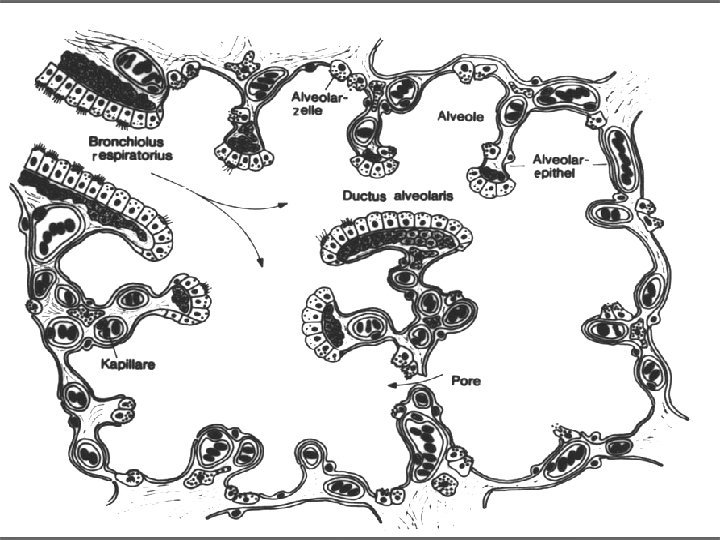 Plicní alveolus (300 – 500 mil. v každé plíci, plocha 70 – 80 m 2) n n n respirační epitel (2 typy pneumocytů: membranózní* - 97% plochy, výměna plynů, granulovaný** – 3% plochy, plicní surfaktant retikuloelastická membrána (vlákna, fibroblasty, amorfní substance) krevní kapiláry – souvislé Póry v interalveol. septu – kolat. cirkulace vzduchu alveolární makrofágy * alveolární buňky I, ** alveolární buňky II