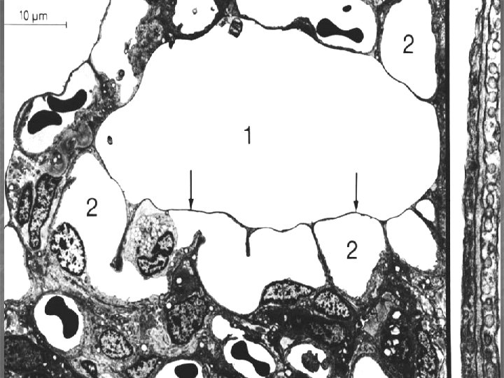 Krev-vzduch bariéra (šířka 0, 1 – 1, 5 μm) n n n surfaktant cytoplazma membranózního pneumocytu lamina basalis respiračního ep. lamina basalis endotelu kapiláry cytoplazma endotelové buňky