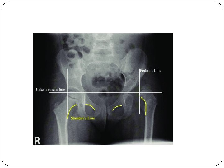 Cont… � 3. Galeazzi test “sign” : It is performed by flexing the knees while lying down so that the feet touch the surface and the ankles touch the buttocks. If the knees are not level (apparent limb length discrepancy) then the test is positive. Shorter leg is the affected leg.