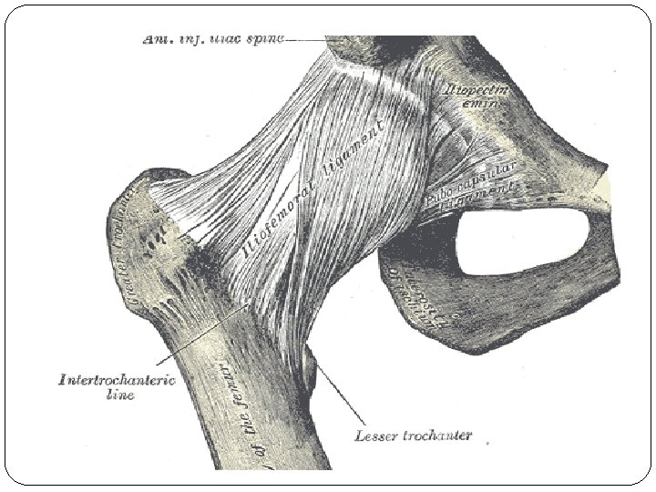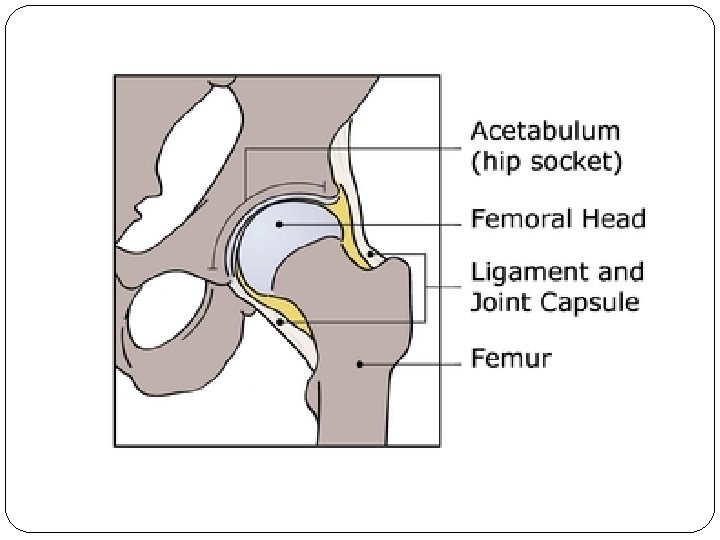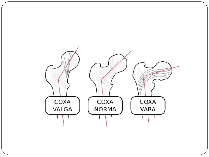 Cont …. Pathology: a. The acetabulum is shallow (shaped like a saucer instead of a cup). b. The femoral head gets dislocated. c. The capsule is stretched and the ligamentum teres becomes elongated and hypertrophied. Two forms of femoral dysplasia are: Coxa vara, in which the femur head grows at too narrow an angle to the shaft. Coxa valga, in which the angle is too wide.