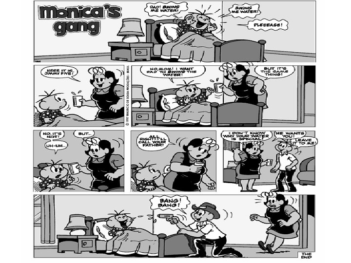 De acordo com a historinha anterior, responda as questões propostas: QUESTÃO 1: Por quê o Cebolinha só quer beber água com o pai? QUESTÃO 2: Qual a reação da mãe de Cebolinha ao ver que ele não aceita a água que ela trouxe? QUESTÃO 3: Does Cebolinha drink water? QUESTÃO 4: Who brings the water first? QUESTÃO 5: What does Cebolinha ask to his father? QUESTÃO 6: Where does Cebolinha drink water?