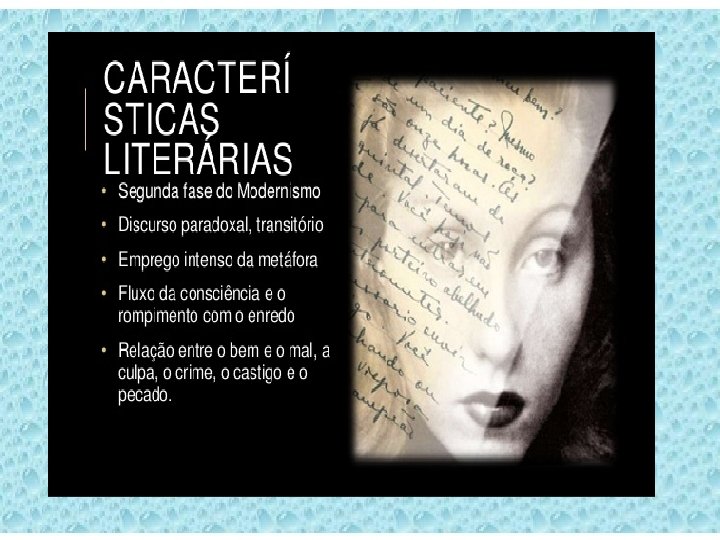 FLUXO DE CONSCIÊNCIA • É uma técnica narrativa utilizada para expressar, por meio de um monólogo interior , os vários estados de espírito e as emoções que caracterizam uma personagem. • Para isso, o narrador apresenta pensamentos sem se preocupar em garantir a articulação lógica entre as ideias • Uma série de impressões (visuais, olfativas, auditivas, físicas , associativas) ganha forma no texto, recriando, em um universo ficcional, o funcionamento da mente humana.