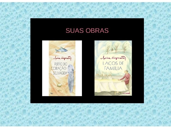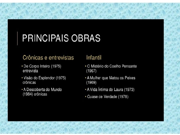 BIOGRAFIA • A autora foi cronista do • Entre suas obras mais Jornal do Brasil. importantes estão a Produzidos entre 1967 e reunião de contos em 1973, esses textos estão "A Legião Estrangeira" reunidos no volume "A (1964), "Laços de Descoberta do Mundo". Família" (1972), os romances "A Paixão Segundo G. H. " (1964) e "A Hora da Estrela" (1977).
