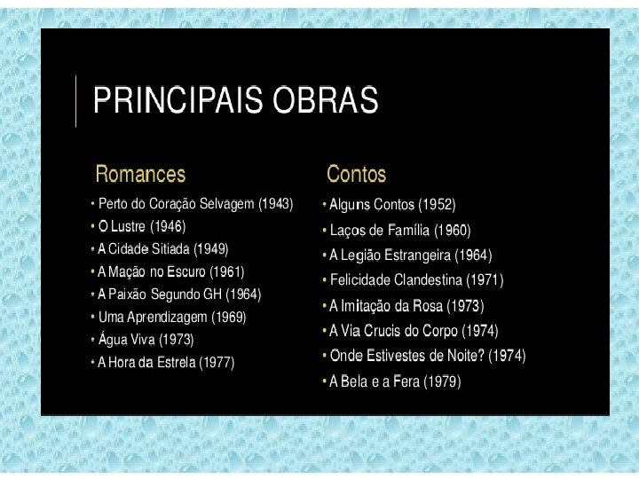BIOGRAFIA • Em 1944, recém-casada com um diplomata(Maury Gurgel Valente de 1943 a 1959), viajou para Nápoles, onde serviu num hospital durante os últimos meses da Segunda Guerra. Depois de uma longa estada na Suíça e Estados Unidos, voltou a morar no Rio de Janeiro. • Clarice Lispector começou a colaborar na imprensa em 1942 e, ao longo de toda a vida, nunca se desvinculou totalmente do jornalismo. Trabalhou na Agência Nacional e nos jornais A Noite e Diário da Noite. Foi colunista do Correio da Manhã e realizou diversas entrevistas para a revista Manchete.