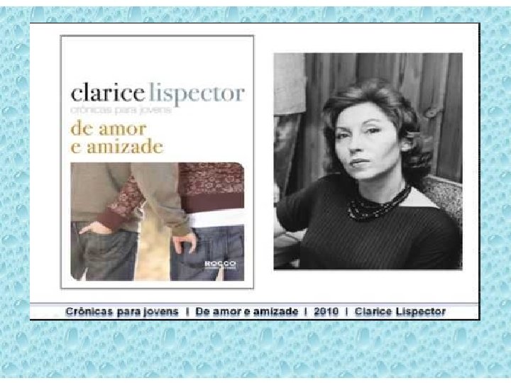 DE AMOR E AMIZADE CRÔNICAS PARA JOVENS LIVRO PÓSTUMO (2010) • Seleção de Pedro Karp Vasquez • Jornal do Brasil – de 1967 a 1974 • Mistura gêneros: escreve para o jornal aos sábados 329 crônicas. • Mais próxima de seu público: • responde cartas dos leitores; • aceita sugestões