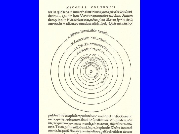 De revolutionibus • Herziening Almagest Ptolemaeus • Opgedragen aan Paulus III • Wiskundige constructies • Zon in middelpunt wereld • Aarde en planeten draaien rond de zon, aarde rond as • Maan draait rond de aarde • Bol sterren onbeweeglijk
