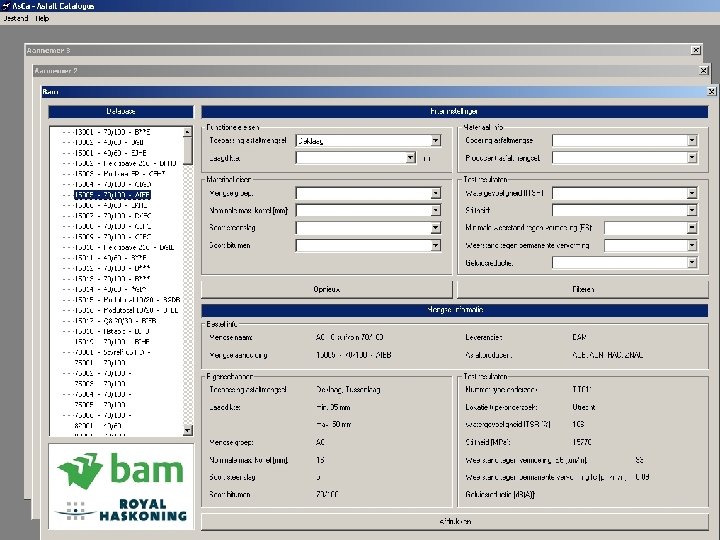 Zoekfunctie Het programma zoekt in de eigen of aangeleverde database naar mengsels die overeenkomen met de wensen. Dat kan zijn: – Het contract – Programma Van Eisen – Mengsellijst producent