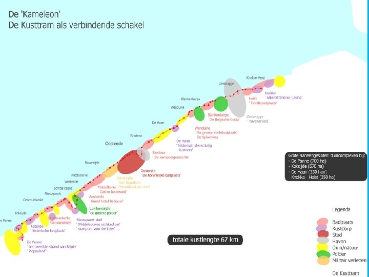 Er zijn ook plannen (Neptunusplan) voor binnenlandse spooraftakkingen (of toevoertramlijnen) van Zeebrugge naar Brugge, van Oostende naar Brugge, van Nieuwpoort naar Diksmuide en van Koksijde naar Veurne. De volledige lijn is 67 kilometer lang en heeft sinds 7 juli 2007 69 haltes. De tram doet er 2 uur en 23 minuten over om deze afstand af te leggen. Om de trambestuurder te ontlasten van de kaartverkoop worden vervoerbewijzen bij de drukste haltes verkocht in zogeheten lijnwinkels. Een kaartje kopen bij de bestuurder is nog altijd mogelijk als de lijnwinkel gesloten is, maar het is wel duurder.