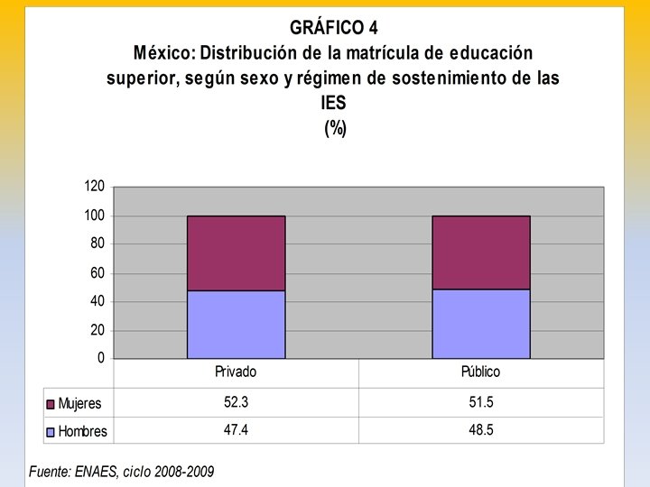 CUADRO 3 México: Medidas centrales del Ingreso familiar mensual de los alumnos, según régimen de sostenimiento de las IES (en pesos) Régimen de sostenimiento de las IES Indicador Privado Público Total Media 22, 877 10, 121 13, 708 Mediana 15, 000 7, 000 8, 000 Moda 20, 000 4, 000 10, 000 Fuente: ENAES, ciclo 2008 -2009.