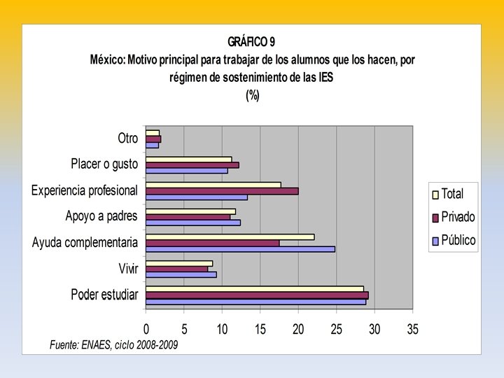 CUADRO 4 México: Condición de actividad de los alumnos de las IES* (%) Tipo de institución Alumnos Privada Pública Total Sólo estudian 58. 8 67. 8 65. 1 Estudian y trabajan 41. 2 32. 2 34. 9 *Tabulado respecto a la pregunta: Durante el último mes y sin considerar las Prácticas Profesionales y el Servicio Social, ¿has trabajado además de estudiar? Fuente: ENAES, ciclo 2008 -2009.