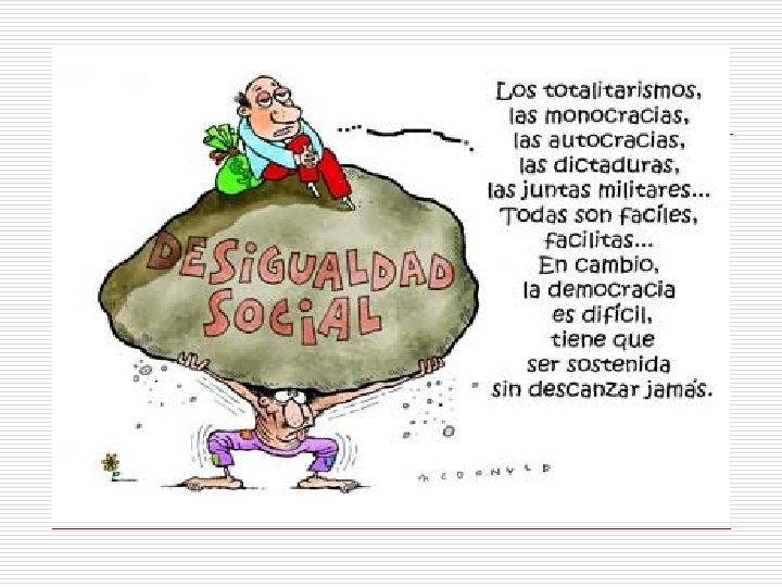 Liberalismo y Democracia o La unidad entre los dos principios se da, pues, en la concepción formal del Estado (liberal-democrático): n La misma esta basada en el reconocimiento de los derechos individuales y en la capacidad del pueblo para gobernarse por sí mismo. “ n En el desarrollo histórico de los gobiernos liberalesdemocráticos modernos la extensión democrática de los principios liberales ha tenido complemento práctico en la concesión de los derechos políticos a todos los ciudadanos y en la participación en el Estado de todos los miemrbos de la sociedad. n Hay un aspecto que presenta serios conflictos en el terreno de la práctica, ya que hay en la democracia una fuerte acentuación del elemento colectivo, social, de la vida política a costa de la individualidad mientras que el liberalismo acentúa el individualismo.