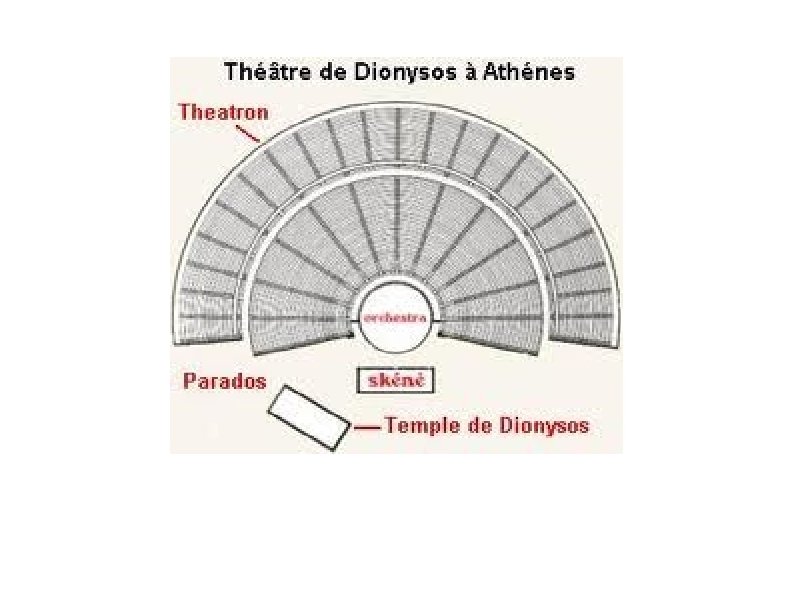 Les représentations ont lieu en plein air dans des théâtres demi circulaires, en marbre. 4 3 1 2 1 : Theatron = l'endroit d'où l'on voit, demi-cercle bâti au flanc d'une colline à l'acoustique exceptionnelle, pouvant accueillir des milliers de spectateurs 2: Orchestra = cercle de terre battue au centre du théâtre 3: Proskénion = bande rectangulaire surélevée de quelques marches 4: skêné= la scène / 3 acteurs