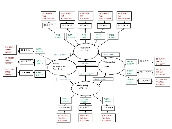 3. 4. Confirmatorische factoranalyse • Vier dimensies met 14 variabelen waarin naast oorspronkelijke intra- (positief identiteitsgevoel), de inter-persoonlijke (sociale habitat) en gedragscomponent (verbondenheid) ook samenwerkingsrelatie (hulpverlening) als afzonderlijke factor. • Kwantitatief toetsen op betrouwbaarheid, validiteit en modelfit.