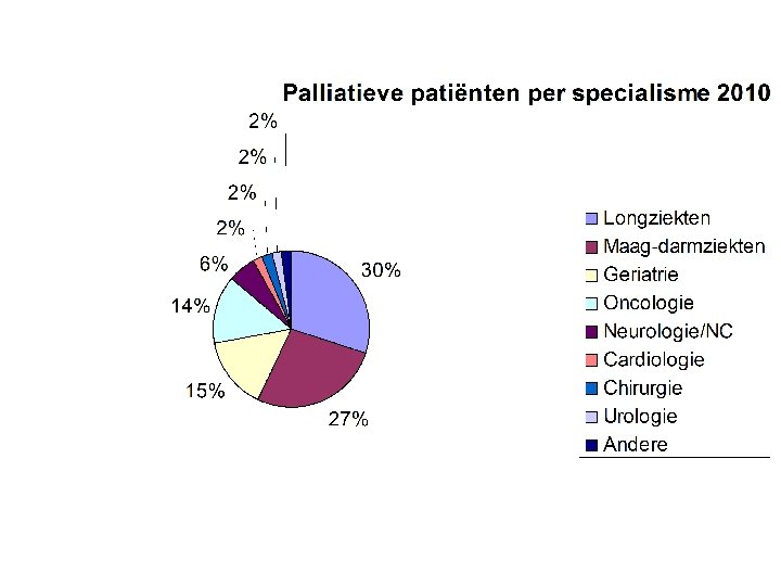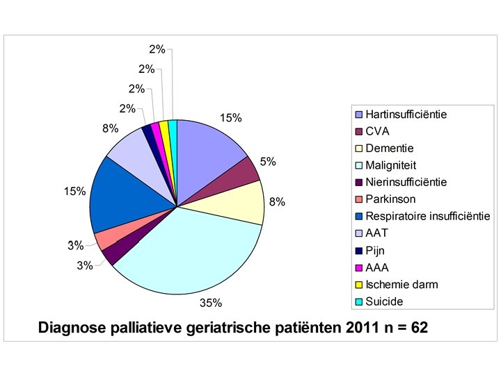 Aard van de pathologie • Gegevens van MKG registratie - hoofdiagnose • Potentieel terminale pathologie - Implicaties voor palliatieve zorgen - kanker - CVA - hartdecompensatie - infectie - pneumonie - gevorderde dementie - Parkinson - deshydratatie met extreme metabole ontregeling - multi-orgaanfalen - combinatie van pathologieën (fysiek en mentaal)