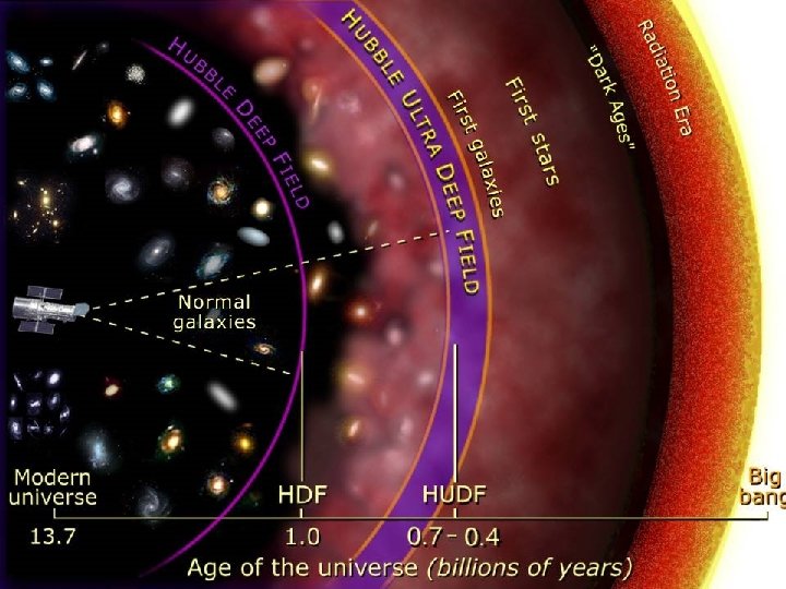 Tot 100 / 200 miljoen jaar na de Big Bang. . . “Dark Ages” De kosmische achtergrond-straling komt als een ‘flits’ vrij. Het neutrale waterstof en helium zendt geen licht uit, althans: een heel klein beetje. Doordat de spin in waterstof atomen kan verspringen, wordt laag energetische 21 cm straling uitgezonden. Dat zou nu bij ons aan moeten komen als radiostraling met een golflengte van ongeveer 210 meter. Een mooi probleem voor de radioastronomie (LOFAR). De Dark Ages hebben hun geheimen nog niet prijs gegeven, materie klonterde samen , maar hoe? wat was er eerder: stelsels of sterren? hoe vormden zich de eerste zwarte gaten?