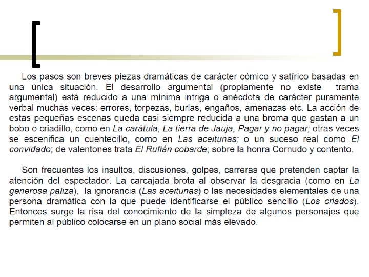 n Se conoce como paso o entremés a una pieza dramática jocosa y de un solo acto, protagonizada por personajes de clases populares, que solía representarse durante el Siglo de Oro español, es decir, a fines del siglo XVI y durante el siglo XVII y XVIII hasta su prohibición en 1780, entre la primera y segunda jornada de una obra mayor. Posteriormente será llamado sainete. En Europa, su equivalente es la farsa, cuya denominación se aplicó en España a cualquier tipo de representación teatral.
