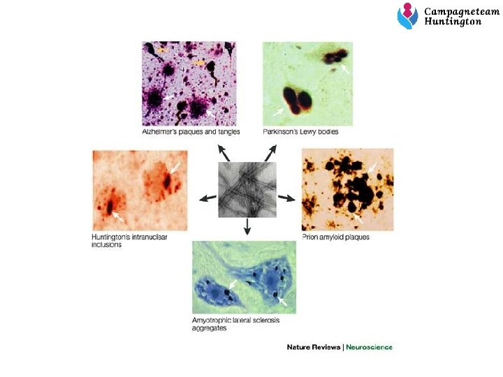 3. Wat doet de Ziekte van Huntington in je hersenen precies? De ziekte van Huntington wordt veroorzaakt doordat er bepaalde eiwitten gaan klonteren in hersencellen. Deze eiwit-klonteringen zie je bij veel hersenziektes waaronder Alzheimer en Parkinson. Je kan ze met de microscoop zien in de hersencellen (met een witte pijl aangegeven in de volgende dia).