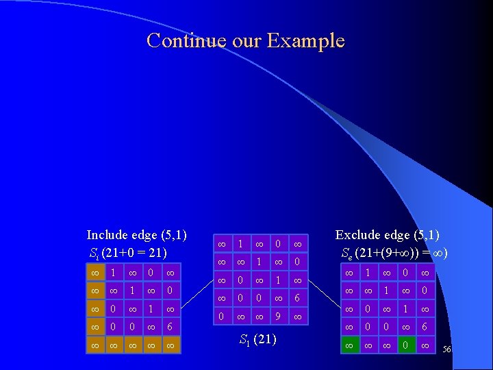 Premature Cycles An issue which must be dealt with: Premature cycles l If edge (i, j) is included, then edge (j, i) can not be used and must be marked as infinite in Si l l In the case below (5, 1), (1, 5) already happened to be infinite, but normally may not be Include edge (5, 1) Si (21) ∞ 1 ∞ 0 ∞ ∞ ∞ 1 ∞ 0 ∞ 1 ∞ ∞ 0 0 ∞ 6 ∞ ∞ ∞ 1 ∞ 0 ∞ 1 ∞ ∞ 0 0 ∞ 6 0 ∞ ∞ 9 ∞ S 1 (21) Exclude edge (5, 1) Se (∞) ∞ 1 ∞ 0 ∞ ∞ ∞ 1 ∞ 0 ∞ 1 ∞ ∞ 0 0 ∞ 6 ∞ ∞ ∞ 0 ∞ 50
