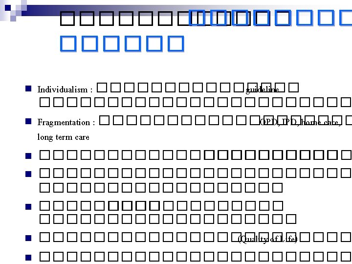 Essential elements for action n n Support a paradigm shift towards integrated, preventive health care Promote financing systems and policies that support prevention in health care Equip patients with needed information, motivation, and skills in prevention and selfmanagement Make prevention an element of every health care interaction