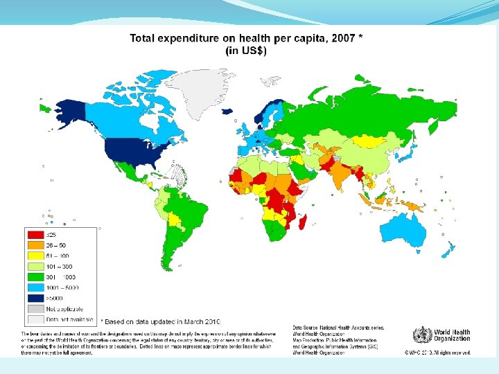 Primary Health Care Declaration of Alma-Ata (1978) • Health is a fundamental human right & worldwide goal and requires inter-sectoral action to attain • Improved health and peace requires economic and social development based on New Intl Economic Order • Governments have responsibility to provide adequate health and social measures for health • Primary health care is appropriate, accessible, acceptable, affordable and requires community participation • International cooperation is necessary • HFA 2000 requires redirecting resources from military to social expenditures (including health) Source: WHO 1978