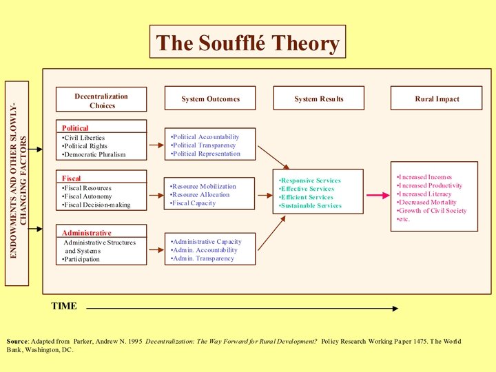 Our Soufflé Theory • Rural Impacts -- the long-term results • Service Delivery System Results -reformed institutions • Service Delivery System Outcomes -medium term changes in the system • Decentralization choices -- three dimensions • Institutional endowments -- the environment
